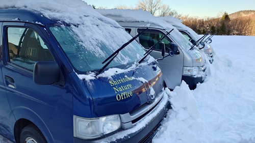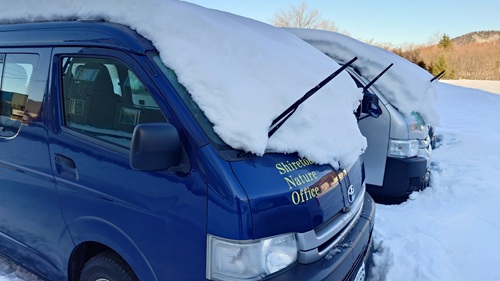 重い雪からガリガリへ 弊社のハイエースを見ると、先日の降雪量がよくわかります。降ってた頃はべちゃべちゃの重い雪でしたが、今は凍ってガリガリです。 土曜、日曜は気温がプラスの7度前後の予報。まだしばらくは融けては凍っての繰り返しになりそうですね。 知床ネイチャーオフィス柴田