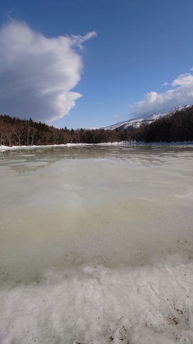 場所によっては氷が融けて湖上を歩けない場所が発生。