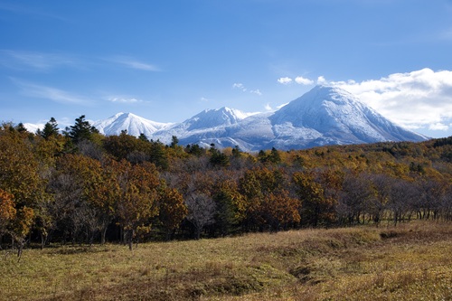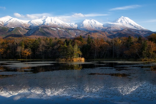 紅葉と冠雪した知床連山