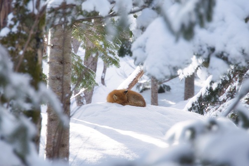 日差しの中森ではキタキツネがひっそりと寝ていました