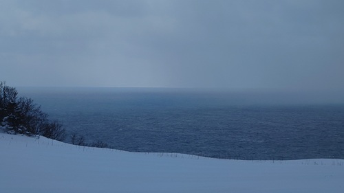 標高約100mの高台から水平線に流氷らしき白い線を確認できます。