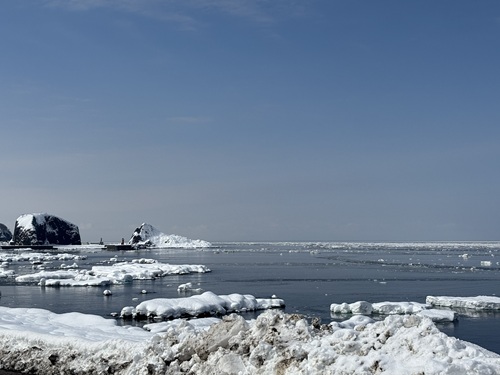 2026年3月16日の流氷 <ウトロからの流氷>流氷を確認することが出来ます。 <流氷の状況>多くの流氷を確認できます。昨日に比べると、より流氷は岸から離れました。今後も数日は風向きが変わりやすい予報のため、岸に寄ったり離れたりが続きそうです。 知床ネイチャーオフィス