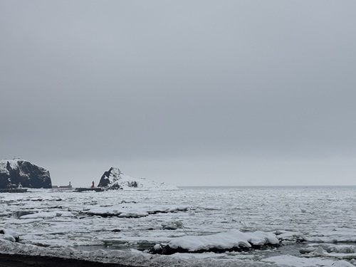 2026年3月24日の流氷 <ウトロからの流氷>弊社オフィス前は流氷を確認できます。 <流氷の状況>高台から見ても沖まで流氷は隙間なく岸に押し寄せています。今日の日中は北風予報のため今日中はまだこの景色を楽しめそうです。 知床ネイチャーオフィス