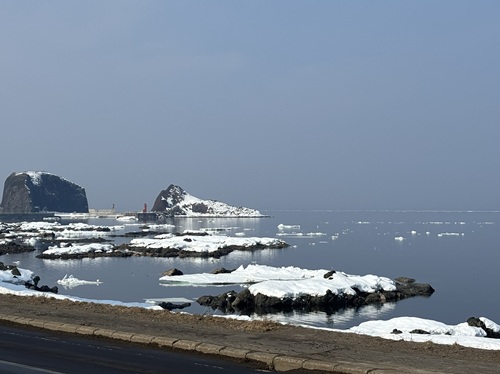 2026年3月31日の流氷 <ウトロからの流氷>流氷を確認できます。 <流氷の状況>昨日よりも流氷の塊は沖へ移動しました。事務所前からも水平線にうっすら流氷の帯を確認することができます。 知床ネイチャーオフィス
